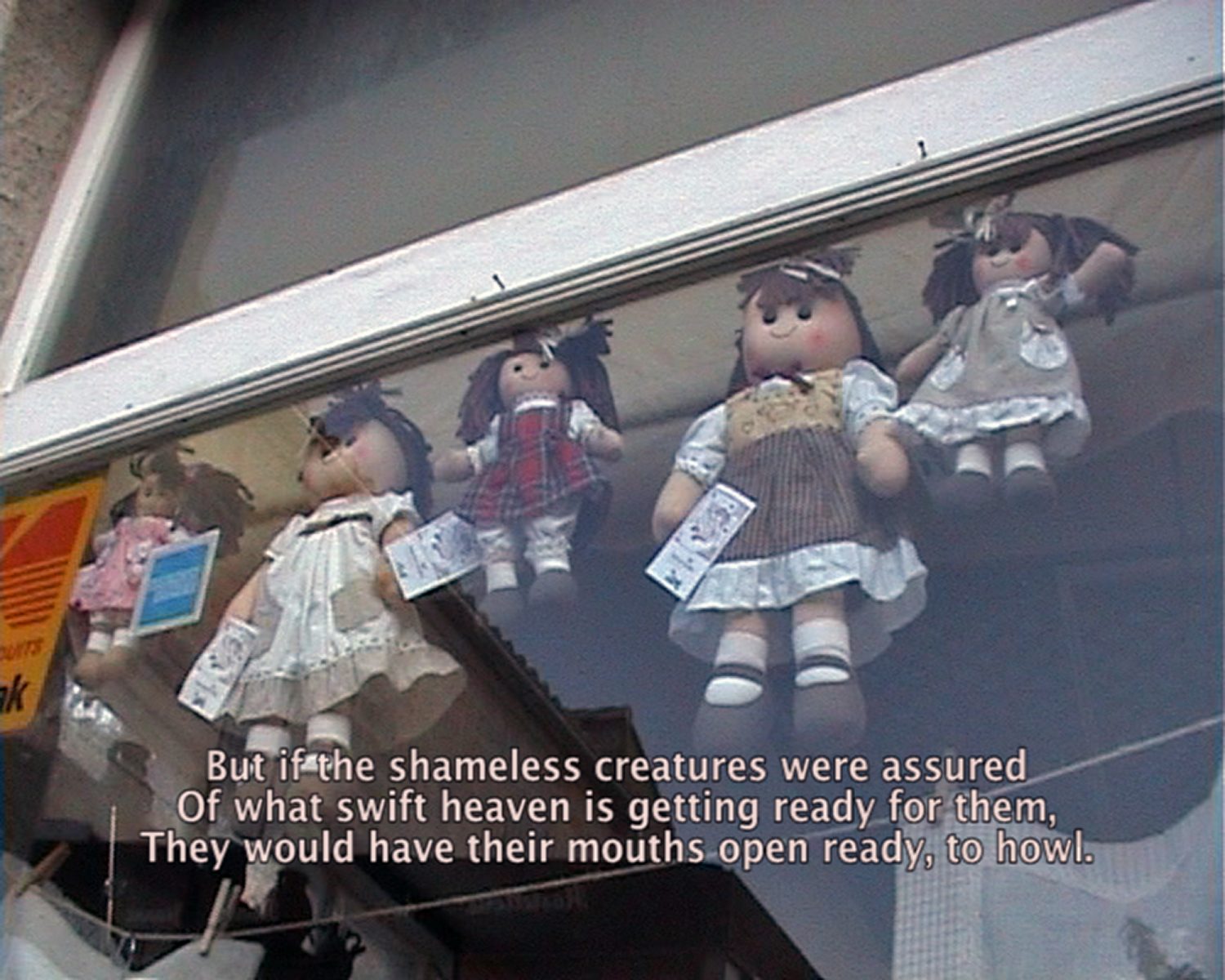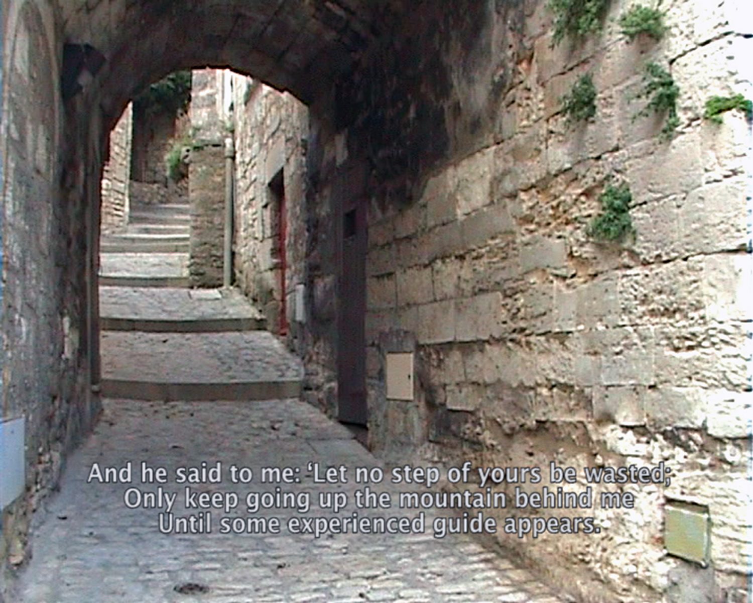 At Les Baux, a picturesque town on a hilltop now solely existing as a holiday hotspot, a video was shot drawing a tantalising parallel to what a contemporary purgatory could be – souls walking aimlessly from place to place to find a way out are compared to the modern touristic approach searching for the consummate experience or souvenir. Beginning at a road into Les Baux, through streets of gift shops to a medieval castle hilltop, the resulting video contains quotes from Dante’s Purgatorio to create uncanny juxtaposition.