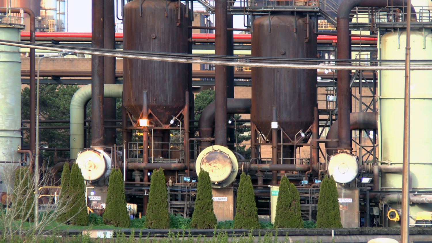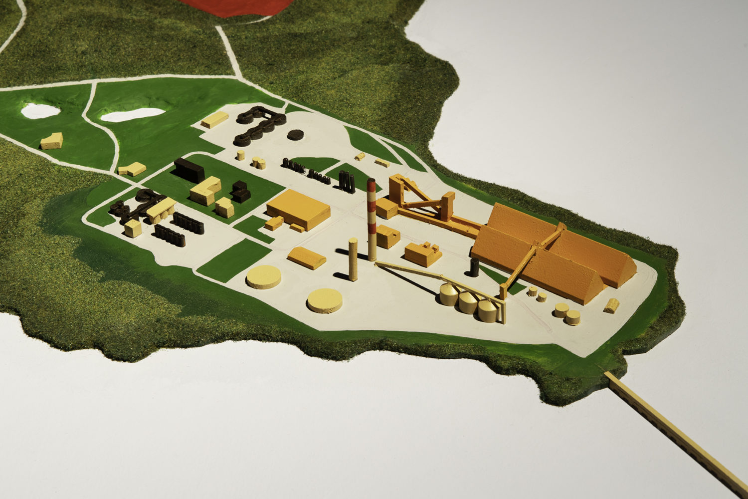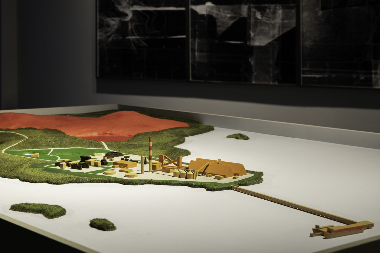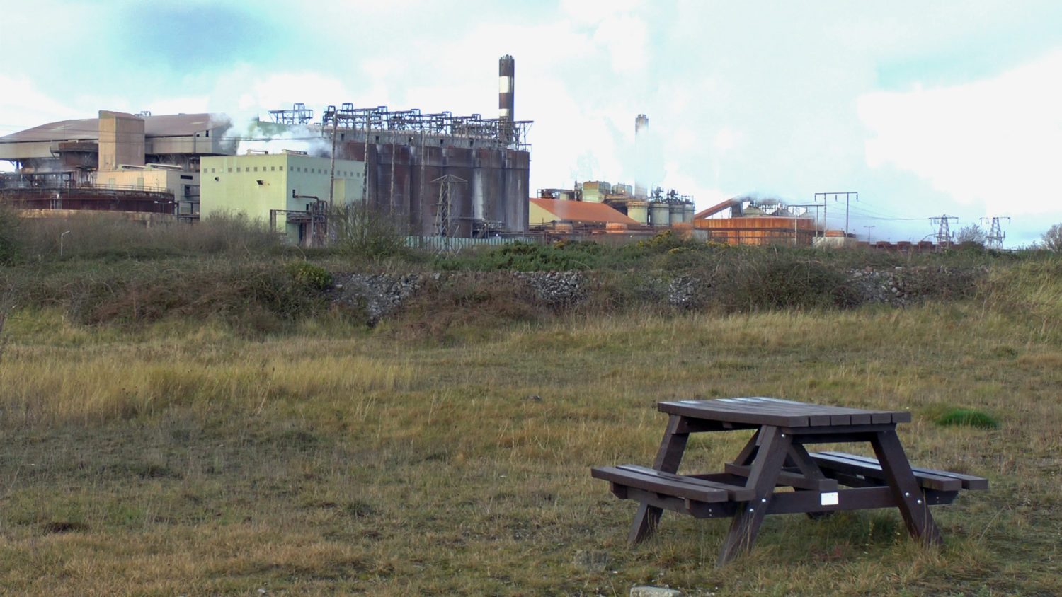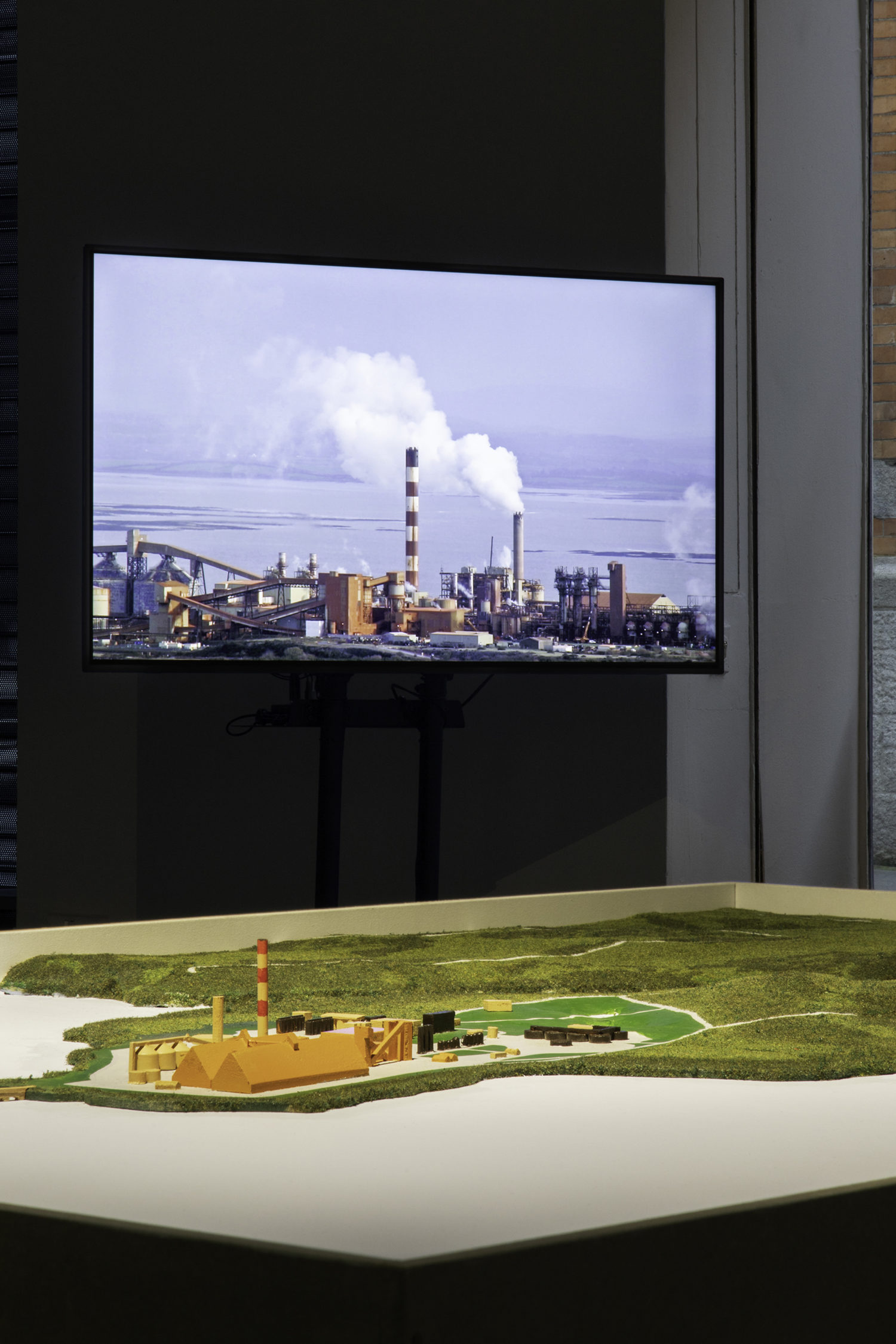 From blaming winds from the Sahara desert for toxic dust storms in the locale, to newspaper advertisements singing the virtues of the industry for local school children, and careful evasion of Environmental Protection Agency protocols, the Aughinish plan today continues with plans to extend in size through until 2030, with no conscious environmental or social transition programmes in place. Exhibition curator Michael Hill notes, ‘The film, narrated by Amy Conroy, explores the “greenwashing” practices at the site, including a nearby nature reserve with no visible birds, insects, or sea-life, picnic areas completely overshadowed by the enormous refinery, and futile attempts at beautifying the industrial landscape by planting decorative topiary hedges.’